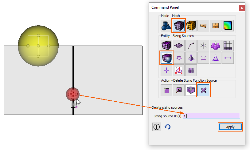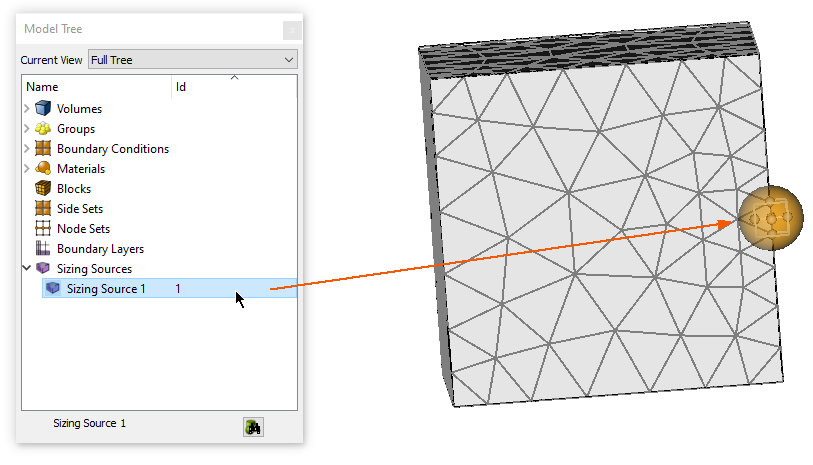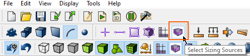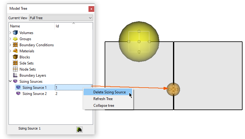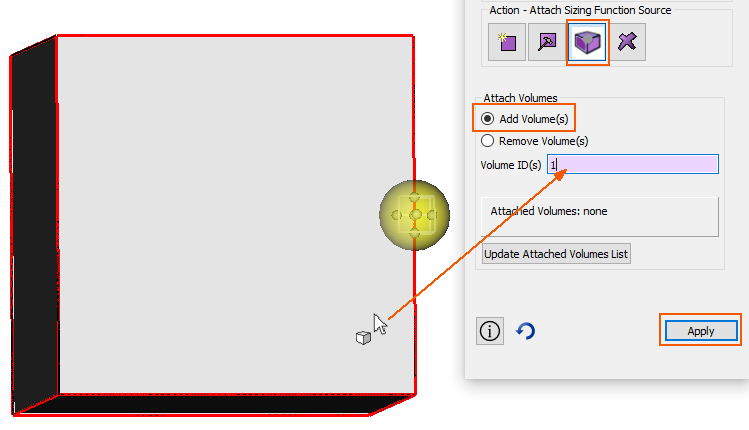 After creating the sizing source ellipsoids the next step is to assign these sizing functions to volumes. Simply creating the sizing sources will not affect the meshing. In order to have these sizing sources act as sizing functions the sources must be attached (or assigned) to volumes.