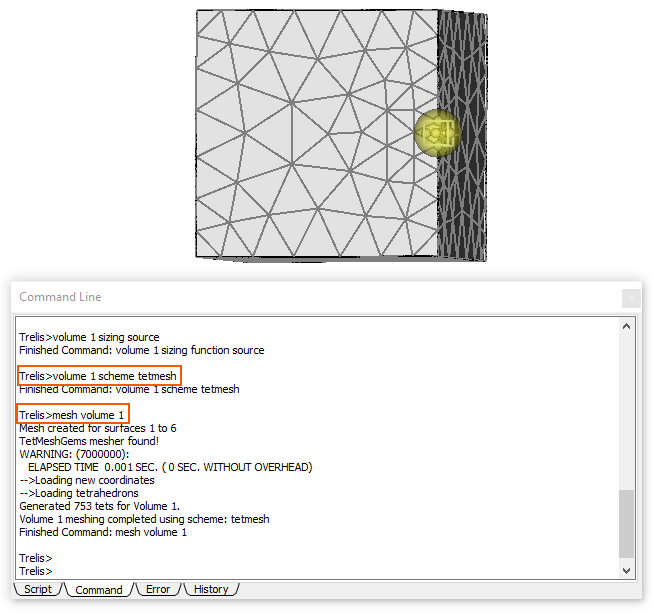 The trimesh and tetmesh schemes in Cubit are based upon third party libraries known as MeshGems that are developed and distributed by Distene. They are robust and fast triangle and tet meshing algorithms that have built in capabilities for adaptively controlling the mesh size based upon feature sizes. In most cases the sizing controls provided as part of the scheme command are sufficient to control mesh sizes. As such, the sizing functions described in this section cannot be used with the the MeshGems triangle and tet meshing algorithms. If a sizing function is assigned to a volume or surface, and the trimesh or tetmesh scheme is selected, rather than using the MeshGems algorithm for meshing the surfaces, it will automatically revert to using the triadvance scheme. Any settings defined with the trimesh or tetmesh scheme will be ignored and the sizing function will be used to determine local mesh sizes. When using the trimesh and tetmesh schemes, recommended practice is to mesh all surfaces and volumes simultaneously. This provides the greatest flexibility to the algorithms to determine feature sizes and their effect on neighboring surfaces and volumes. The default settings for trimesh and tetmesh schemes will automatically provide geometry adaptive mesh sizing. These default settings can however be adjusted by using the settings on the scheme command. The scheme settings are described in the tetmesh and trimesh sections of the documentation.
