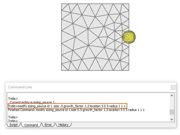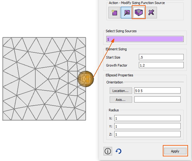 An intuitive method for adding a sizing function to the tetrahedral meshing workflow is introduced with Trelis 17.1 in May 2020. This method places a graphical ellipsoid on the model allowing the user to modify the geometry and mesh size settings of the ellipsoid thereby affecting the impact of the sizing function on the mesh.