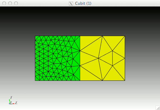 The number of intervals along curves can be specified by setting a desired interval size. The interval size can be set curve by curve, or indirectly set by specifying the interval size on a surface or volume containing that curve. The size for an entity is determined with the following method. If the entity has a size set then that size is used. Otherwise the entity averages the size determined for its parents. If an entity doesn’t have any parents then a size is automatically calculated from all of the geometry in the model. If the auto size functionality is turned off then a default size of 1.0 is used. Some meshing algorithms may calculate a different default size. For example, Suppose you have two volumes that share a face and corresponding curves. If the size on volume one is set to 1.0 and the size on volume two is set to 3.0 then the size for the common face will be set to 2.0. The size for the remaining faces on volume one and two will be 1.0 and 3.0 respectively. The size for the common curves will be set to 2.0. To specify the approximate size for a volume, surface or group