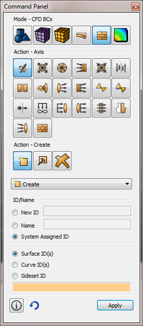 Cubit supports the following CFD boundary condition types. All use the same syntax and use the same command panel (shown below) to create and modify the boundary condition.
