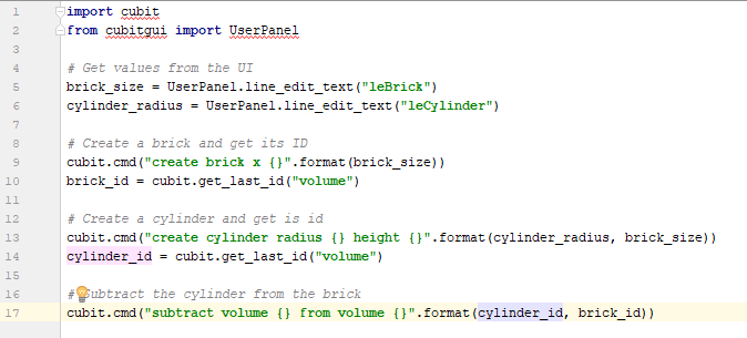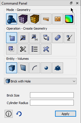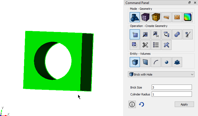 Save apply.py, then in Cubit, set values for the brick size and cylinder radius in the panel and click "Apply" to create a brick with a hole in it.