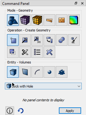 Users are able to create new command panels using https://www.qt.io/download, then add those panels to the navigation XML. The finished panels will be displayed along with the standard Cubit panels and will launch python scripts when the user clicks ’Apply’ or ’Preview’. This tutorial will show the reader how to add a command panel that creates a "Brick with Hole".