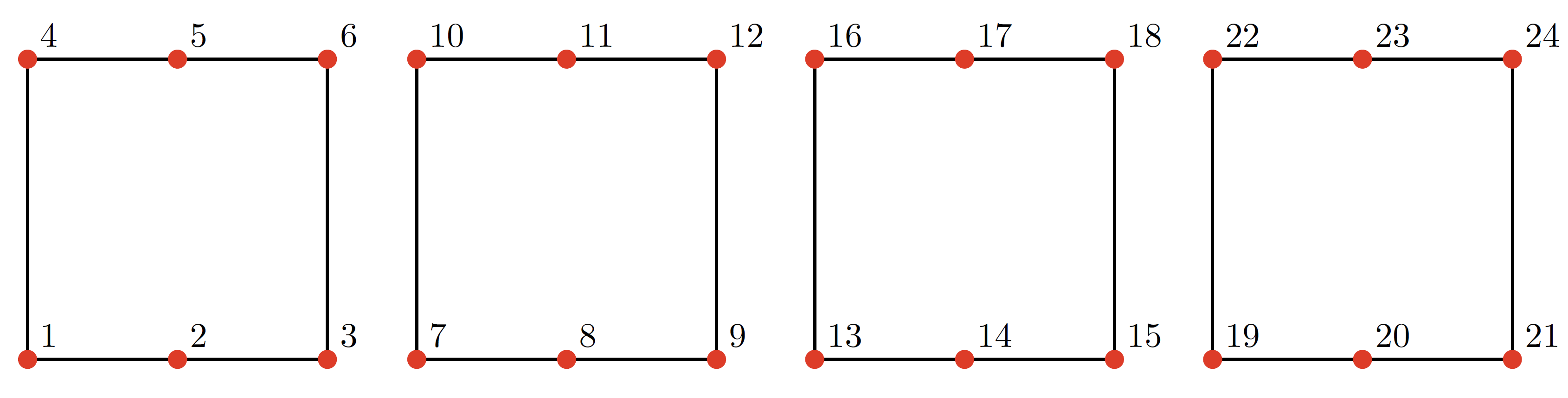 Figure 622: Node ordering for a BEX_HEX element with degree . From left to right, the figures show the nodes corresponding to slices at at at , , and , respectively.