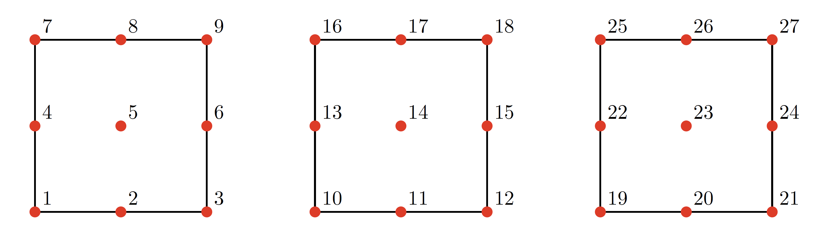Figure 619: Node ordering for a BEX_HEX element with degree . From left to right, the figures show the nodes corresponding to slices at , , and , respectively.
