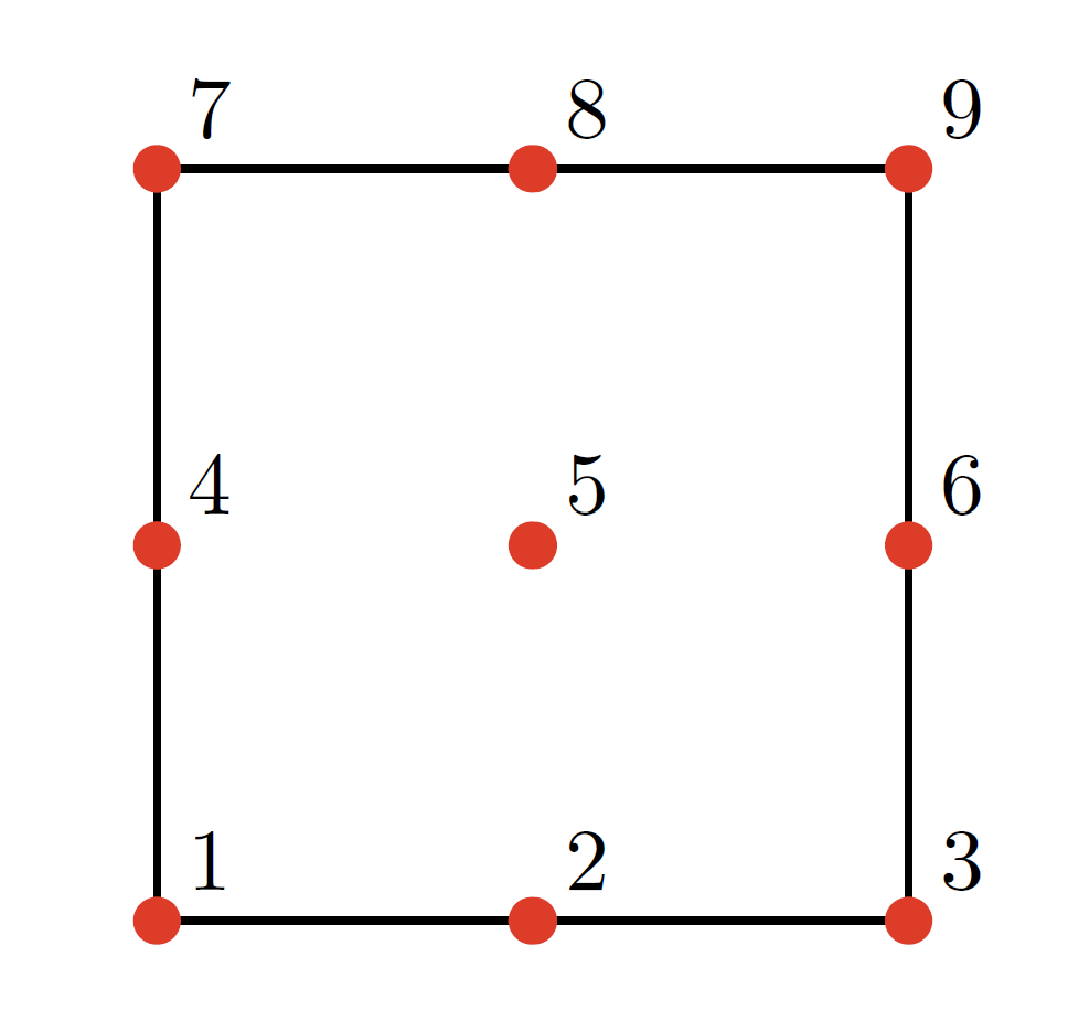 Figure 623: Schematic of the simple U-spline surface created by the Coreform Cubit commands shown above. The surface is composed of two biquadratic Bézier elements, and , with continuity between elements. The global control points are shown in red.