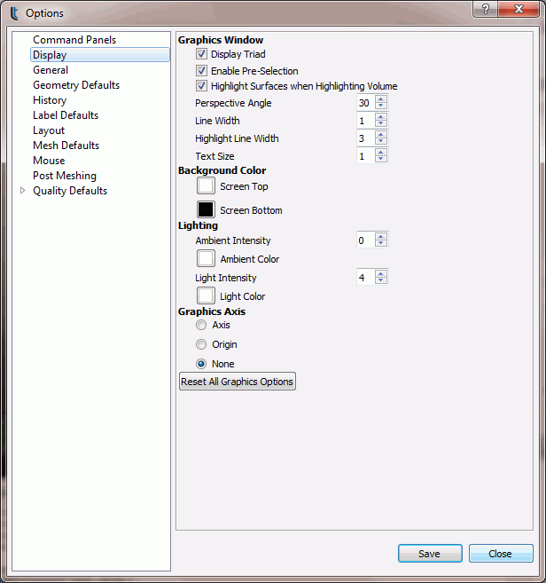 In addition to the commands discussed above, there are several other graphics system options in Cubit that can be controlled by the user.