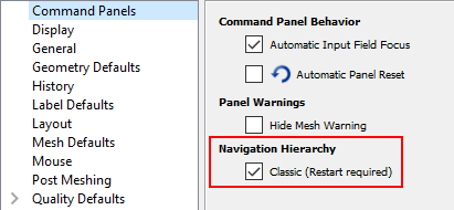 The Classic look includes rows of buttons with icons. The hierarchy is entity-based. Geometric, mesh, and other entity types are the focus of the hierarchy. A user navigates entity types then selects actions to perform on those entities.