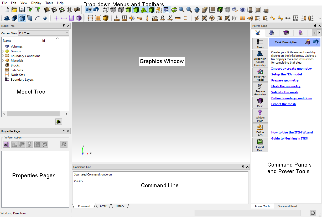 The graphical user interface (GUI) can improve user productivity. It provides an easy way to control Cubit without learning command syntax. Many geometry commands are faster and easier with the GUI. The underlying GUI components are constructed using a cross-platform development environment. As such, the GUI will behave similarly across all platforms supported by Cubit, yet each GUI will make use of platform specific widgets. The GUI is built on top of the Cubit command line. This means that GUI actions are translated to a Cubit command-line string and journaled. Users familiar with command-line syntax can enter the same text in the GUI command-line window. Journal files can be created and played back in both environments with the same results. Although many things are faster and easier in the GUI, experienced users often use a combination of command line text and GUI button operations. The discussion of the Graphical User Interface and its features is based on the basic windows contained within the Cubit GUI Application Window. These are outlined in the subtopics listed above.