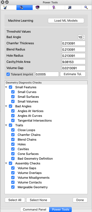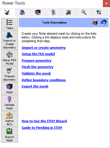 Power Tools - Geometry analysis and repair tool, meshing tool, meshing quality tool, and ITEM Wizard.