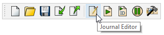 Journal Editor - Opens journal file editor. The Journal Editor is used to write, edit, play, and save journal files. It can also be used to create and edit Python scripts. A built-in translator will convert between the two files types.