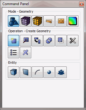 Below is the command panel showing Geometry. Notice the second row shows actions, such as create, modify, transform, boolean, decomposing, and so forth. The third row shows geometry types. This hierarchy implies many geometry operation types are applicable to most entity types.