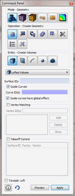 In all cases, regardless of the button hierarchy, the user will finally be presented with a command panel. Shown is the command panel for creating lofted volume.