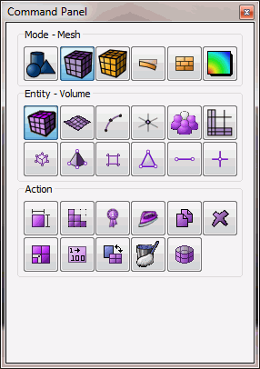 Below is the command panel showing Mesh. Here, the second row shows the various entity types. The third row shows operations that can be performed on those entity types. This hierarchy implies mesh operations tends to be more specific (when compared to geometry operations) to a given mesh entity.