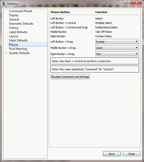 Options - Opens the Option dialog box. This dialog box controls all of the preferences for the GUI including display colors and widths, mouse settings, journal file options, mesh and geometry defaults, and general layout preferences. MAC users can find this menu under the Cubit tab.