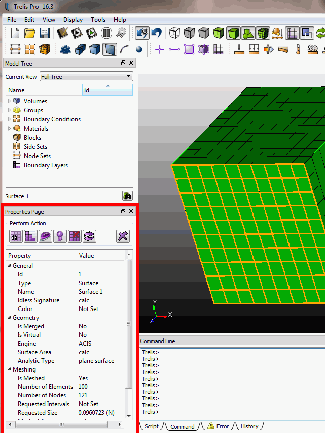 The Property Page provides a convenient way to change attributes on entities. . Some of the fields cannot be changed, some can be edited from an input field, and others are edited by selecting from a list, or by opening the corresponding window from the Control Panel. If multiple entities are selected, the attributes that are similar to both entities will be shown. Changing an attribute from the property page will change that attribute on both entities. If multiple entities are selected the total volume, surface area, and length of all entities will be shown. Below is a summary of properties listed for each attribute type.