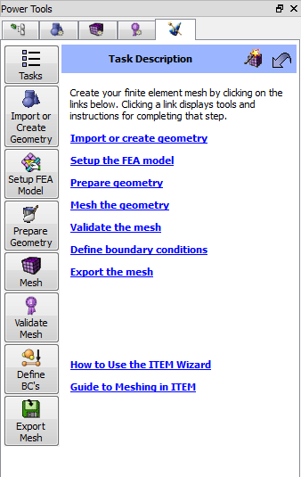 There are two help links at the bottom of the main task page. The first link will open this document which describes the general ITEM process and how to use the panels. This page is only accessible from the main task page. The second link opens the main ITEM documentation which describes each process in the ITEM mesh generation process in detail. This document can be accessed from any of the ITEM panels.