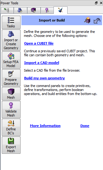 The Immersive Topology Environment for Meshing (ITEM) is a wizard-like environment that guides the user through the mesh generation process from geometry definition to export. ITEM was designed to provide a step-by-step set of tools to help new users generate a mesh with very little previous knowledge of the Cubit program. But ITEM is also flexible enough to accommodate advanced users who want to use a more iterative approach, or who just want to use ITEM for a specific tool or panel.
