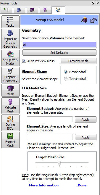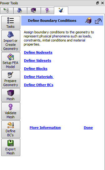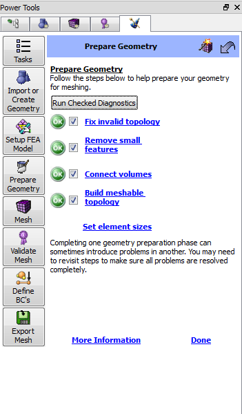 Many meshing tasks require an iterative approach to the mesh generation process. For your convenience, if you do click on one of the task buttons from a different panel, it will take you to the last visited panel in that section. For example, if you are on the mesh generation page, and you click on the prepare geometry section, it will take you to the last page you visited in the prepare geometry section.