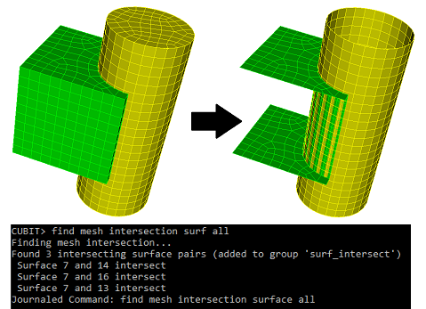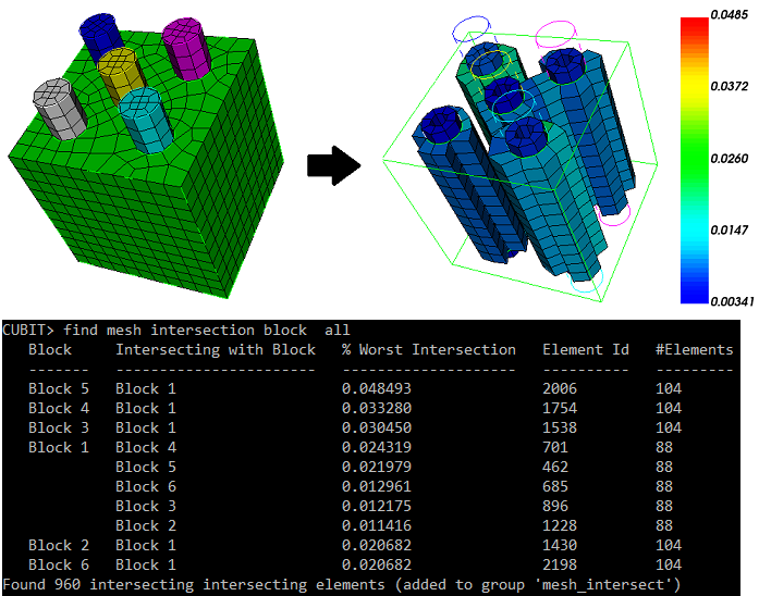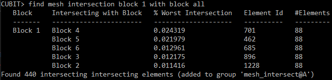 Find Mesh Intersection {Block|Body|Surface|Volume} <id_list> [with {Block|Body|Surface|Volume} <id_list>] [low <value=0.0001>] [high <value>] [exhaustive] [worst <num_worst>] [draw] [log] [group<’name’>]