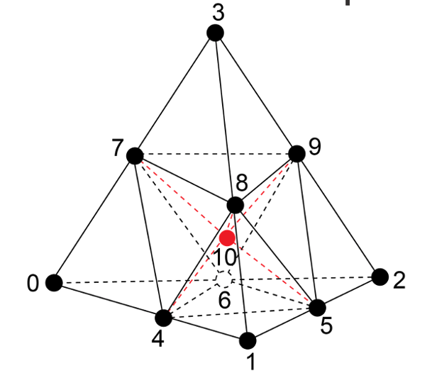 normalized inradius: Ratio of minimum subtet inner radius to tet outer radius (circumsphere). Subtets are defined by subdividing the tet into 12 smaller tets by using a common point at the centroid of the tet and the 6 mid-edge nodes as shown in Figure 371. The minimum in-radius of any of these 12 tets normalized by its parent outer-radius and a constant is used to determine this metric. The Normalized Inradius metric is also valid for linear elements, except that all mid-edge nodes are defined as the midpoint of their corner nodes.