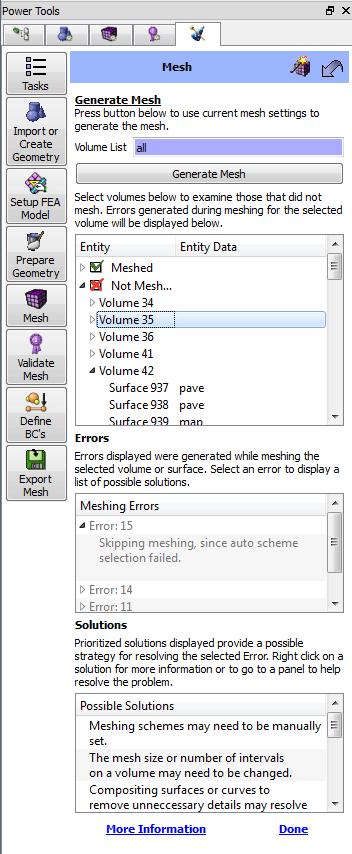 Action: The volume schemes can be set explicitly from the Volume-Mesh control panel. The "Set Source and Target" panel in ITEM can be used to aid in setting explicit source and target surfaces for swept meshes.