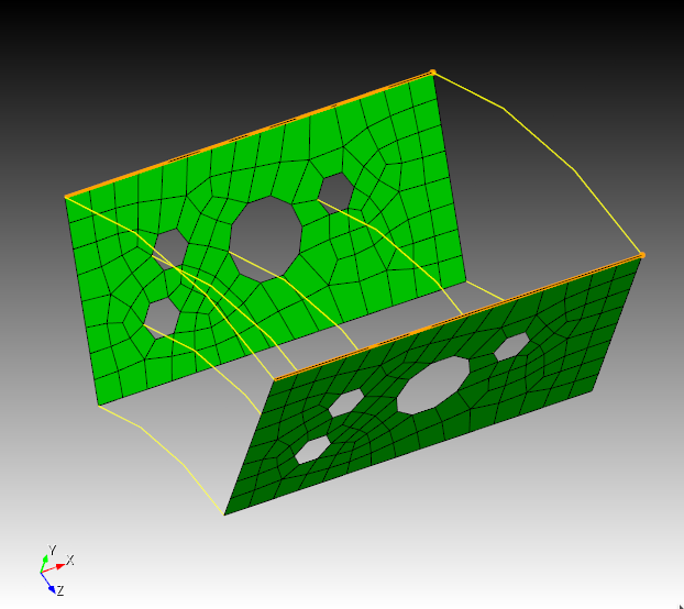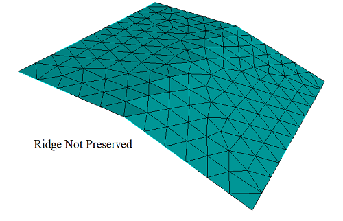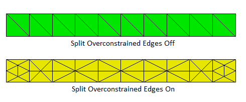 The global split overconstrained edges, if set to on, splits edges owned by the surface, but with both nodes on curves. This feature can help when two elements through the thickness of the mesh is desired. Figure 358 shows the effect of this option.