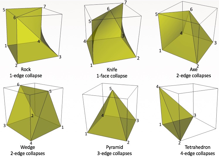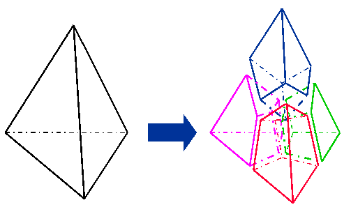 Figure 230: Conversion of a tetrahedron to four hexahedra, as performed by the THex algorithm.