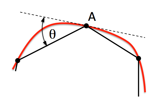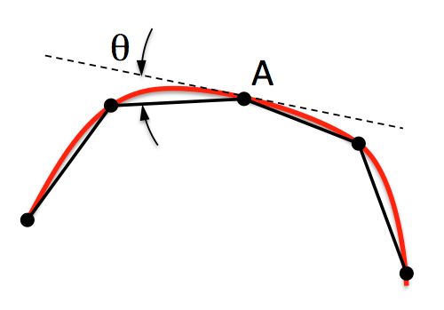For non-planar CAD surfaces and non-linear curves, an approximation must always be made to capture the curved features using the linear edges of the triangle. When a geometry approximation angle is specified, the triangle mesher will adjust triangle sizes on curved boundaries so that the linear edges of the triangle will deviate from the geometry by no greater than the specified angle. Figure 353 illustrates how the geometry approximation angle is determined. If the red curve representes the geometry and the black segments represent the mesh, the angle θ is the angle between the tangent plane at point A and the plane of a triangle at A. θ represents the maximum deviation from the geometry that the mesh will attempt to capture. As shown in figure 2(b), a smaller geometry approximation angle will normally result in more elements, but it will more closely approximate the actual geometry. The default approximation angle is 15 degrees.