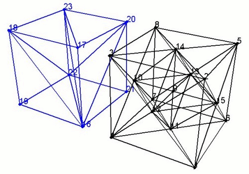 With this approach, 28 tetrahedra are generated for every hexahedra in the mesh. This method adds a node to each face of the hex and one to the interior. Although this method generates significantly more elements, the orientation and quality of the resulting tetrahedra are more consistent. Each previously existing interior node in the mesh will have the same number of adjacent tetrahedra.