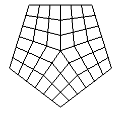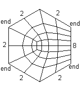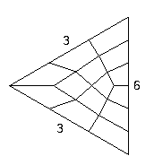 Discussion: The triprimitive scheme indicates that the region should be meshed as a triangle. A surface may use the triprimitive scheme if three "natural", or obvious, corners of the surface can be identified. For instance, the surface of a sphere octant (shown in the figure below) is handled nicely by the triprimitive scheme. The algorithm requires that there be at least 6 intervals (2 per side) specified on the curves representing the perimeter of the surface and that the sum of the intervals on any two of the triangle’s sides be at least two greater than the number of intervals on the remaining side. The following figure illustrates a triprimitive mesh on a 3D surface. By default, the triprimitive algorithm will smooth the mesh with an iterative smoothing scheme. This smoothing can be disabled by using the "nosmoothing" option with this command. The quality of the mesh will often be significantly degraded by disabling smoothing, but in certain cases the unsmoothed mesh may be preferred.