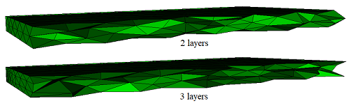 The anisotropic layers setting attempts to place the specified number of layers of tetrahedra through thin regions of the volume while respecting the volume mesh size in the thick direction. The default number of layers is two. This option is currently under development and can sometimes generate high aspect ratio tetrahedra. The number of layers generated can sometimes exceed the number of layers specified..