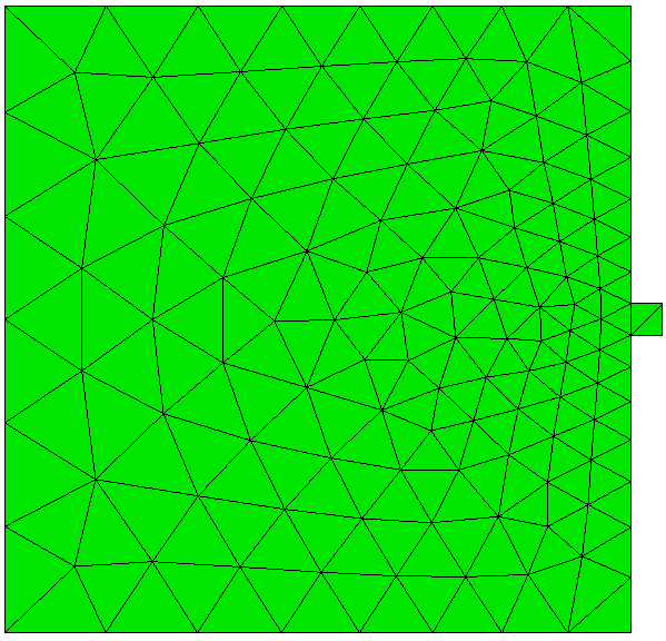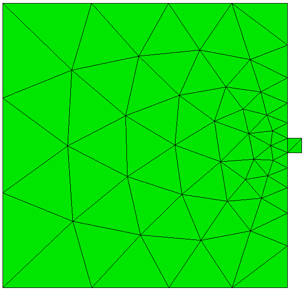 Discussion: The triangle meshing scheme TriAdvance fills an arbitrary surface with triangle elements. It is an advancing front algorithm which allows holes in the surface and transitions between dissimilar element sizes. It can use a sizing function like the pave scheme if one is defined for the surface. Future development will add hard lines to this scheme’s capabilities. You specify this scheme for a surface by giving the command: