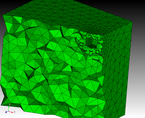 volume gradation will control the growth of triangles where element size has been determined by the proximity of other nearby surfaces. For example, Figure 357a and 5b shows a brick with a small void where the surface meshes are generated with the TriMesh scheme. The surface gradation has been adjusted to a large number so its effect is negligible. The small element size determined for the void is propagated to the exterior surfaces. The resulting gradation of the nearby triangles on the surface is determined by the trimesh volume gradation setting.